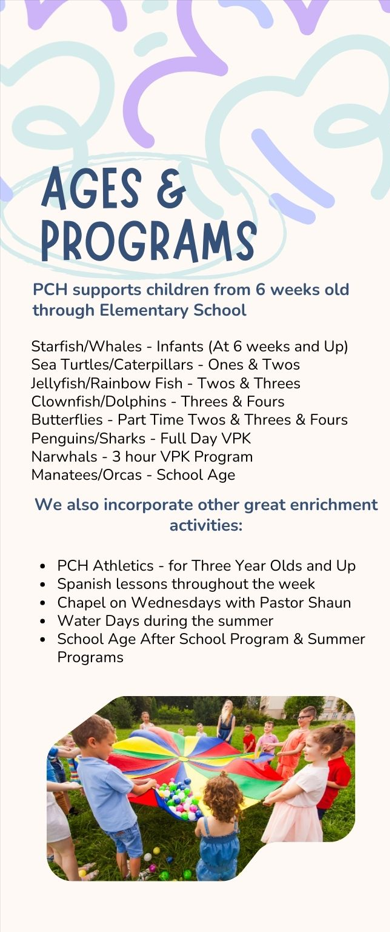 Founded by Julie Laursen in November 2007, PCH Preschool has been serving children from 6 weeks to 12 years old. We are proud of all of our accomplishments, including receiving accreditation from the National Accreditation Commission (NAC) in 2011.